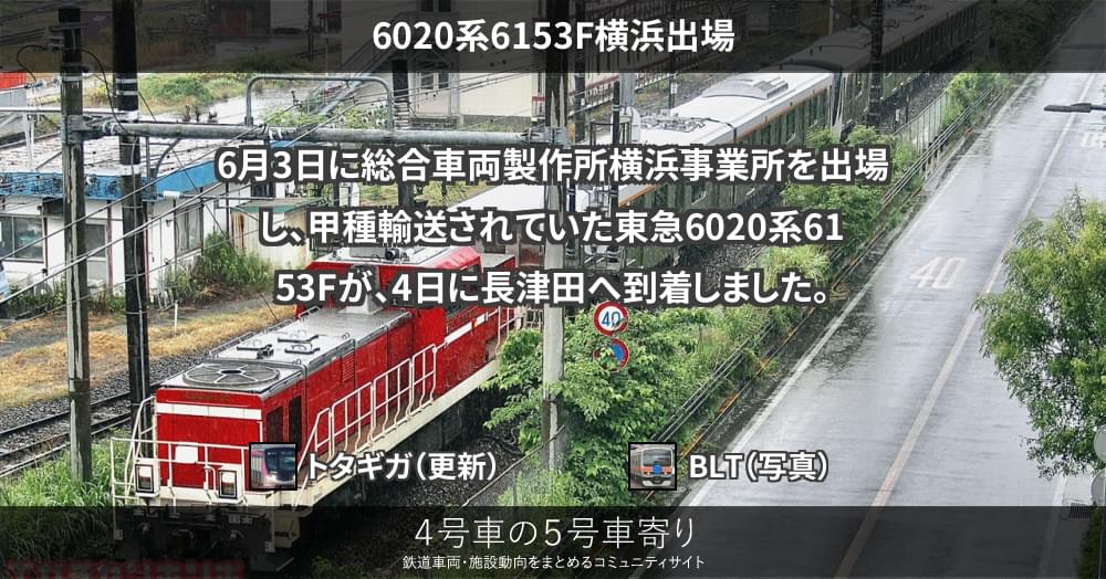 6月3日に総合車両製作所横浜事業所を出場し、甲種輸送されていた東急6020系6153Fが、4日に長津田へ到着しました。