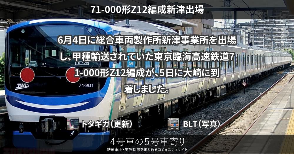 6月4日に総合車両製作所新津事業所を出場し、甲種輸送されていた東京臨海高速鉄道71-000形Z12編成が、5日に大崎に到着しました。