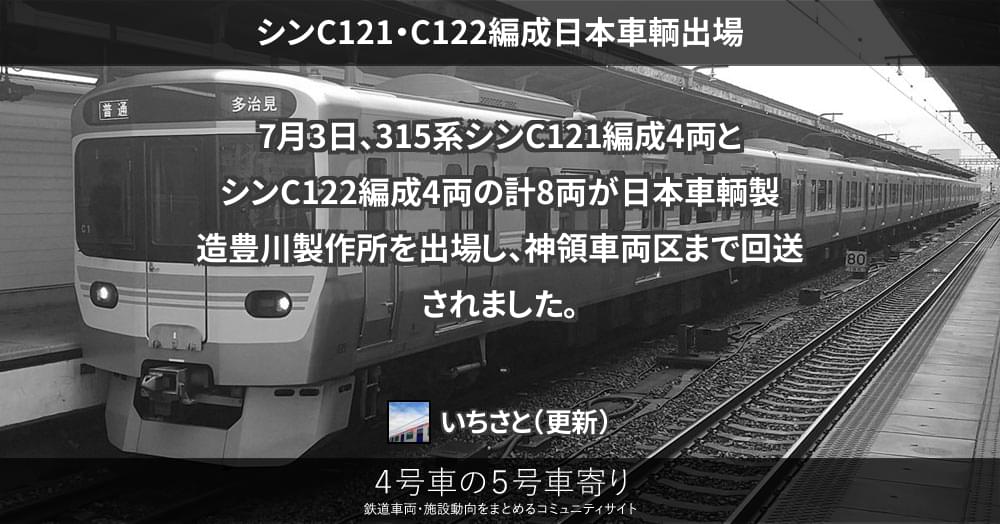7月3日、315系シンC121編成4両とシンC122編成4両の計8両が日本車輌製造豊川製作所を出場し、神領車両区まで回送されました。