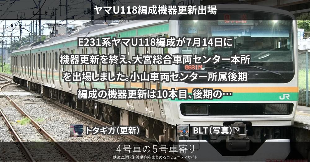 E231系ヤマU118編成が7月14日に機器更新を終え、大宮総合車両センター本所を出場しました。