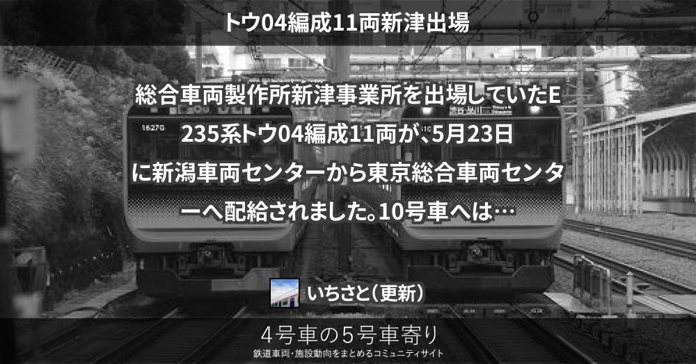 総合車両製作所新津事業所を出場していたE235系トウ04編成11両が、5月23日に新潟車両センターから東京総合車両センターへ配給されました。