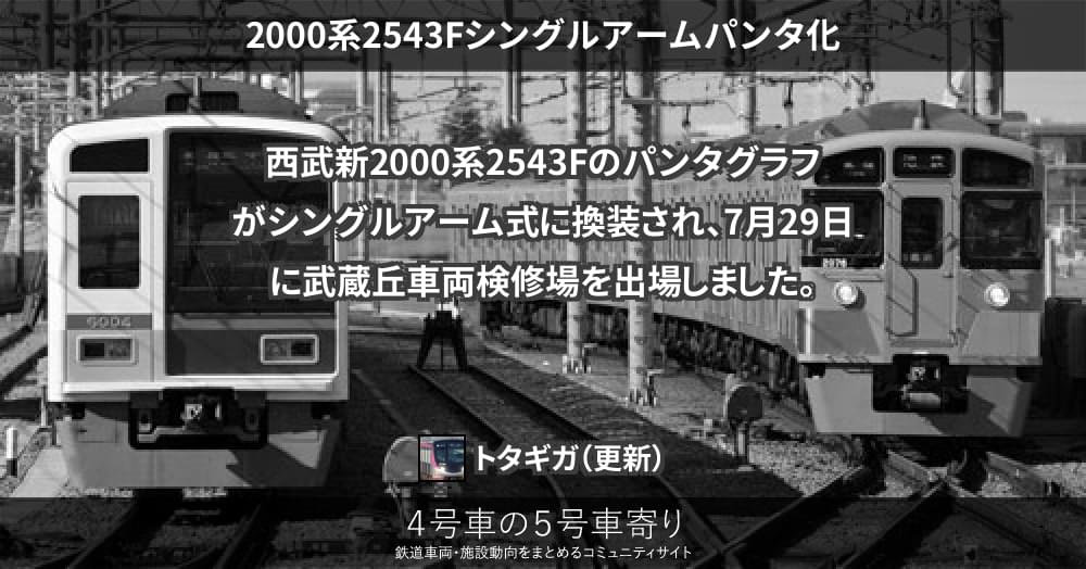 7月29日、西武2000系2543F(4両編成)が武蔵丘車両検修場を出場し、試運転を行いました。この中で、パンタグラフが従来の菱形のものからシングルアーム式のものに換装されたことが確認されました。