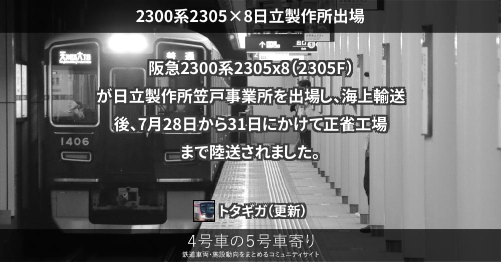 阪急2300系2305x8(2305F)が日立製作所笠戸事業所を出場し、海上輸送後、7月28日から31日にかけて正雀工場まで陸送されました。
