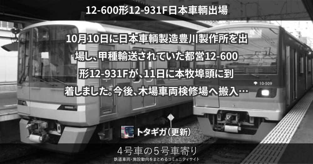 10日、都営地下鉄大江戸線12-600形12-931Fが日本車輌製造を出場し、甲種輸送されています。西浜松まではDD200-17、西浜松からはEF210-375が牽引しています。2025年度は3本目(は年度内に4本新造)になります。