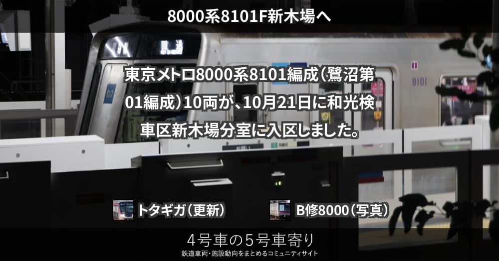 東京メトロ8000系8101編成(鷺沼第01編成)10両が、10月21日に和光検車区新木場分室に入区しました。