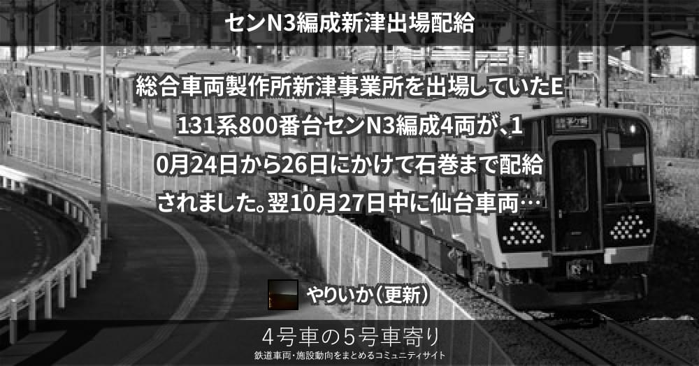 総合車両製作所新津事業所を出場していたE131系800番台センN3編成4両が、10月24日から26日にかけて石巻まで配給されました。翌10月27日中に仙台車両センター宮城野派出所まで回送されています。