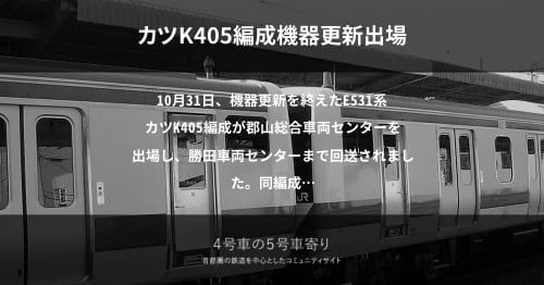 本日、E531系基本編成カツK405編成が郡山総合車両センターを出場しました。約2ヶ月間の車体保全に加えて、少なくともSIVの更新が確認されていることから機器更新が行われたものと推測されます。同編成は、一部の機器更新を2022年6月に同所...