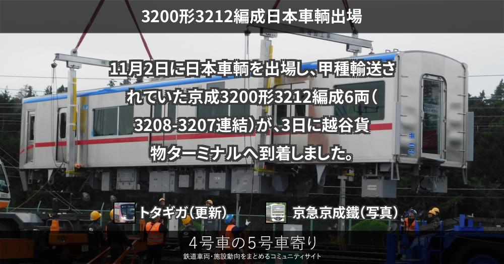 11月2日に日本車輌を出場し、甲種輸送されていた京成3200形3212編成6両(3208-3207連結)が、3日に越谷貨物ターミナルへ到着しました。