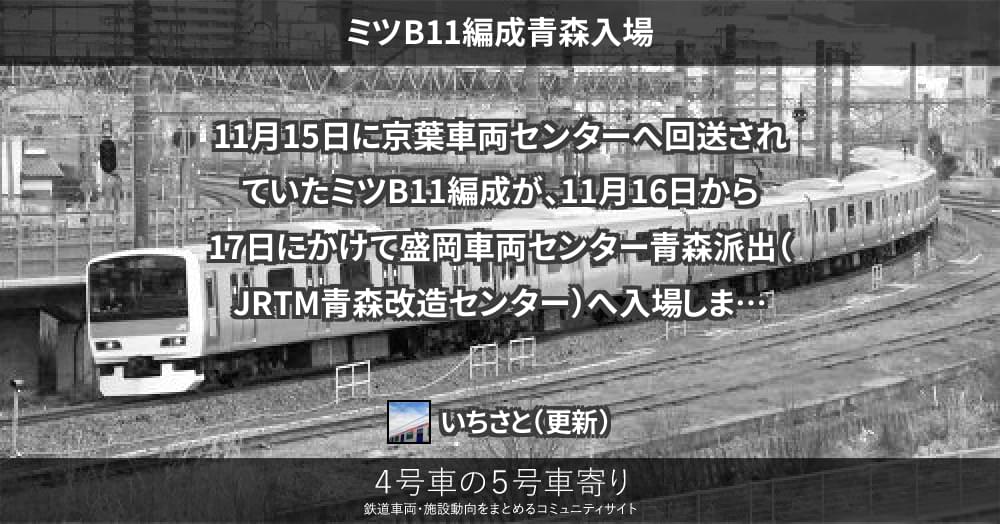 11月15日に京葉車両センターへ回送されていたミツB11編成が、11月16日から17日にかけて盛岡車両センター青森派出(JRTM青森改造センター)へ入場しました。
