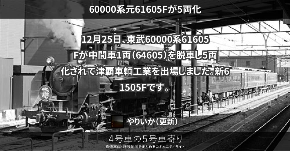 12月25日、東武60000系61605Fが中間車1両(64605)を脱車し5両化されて津覇車輌工業を出場しました。新61505Fです。
