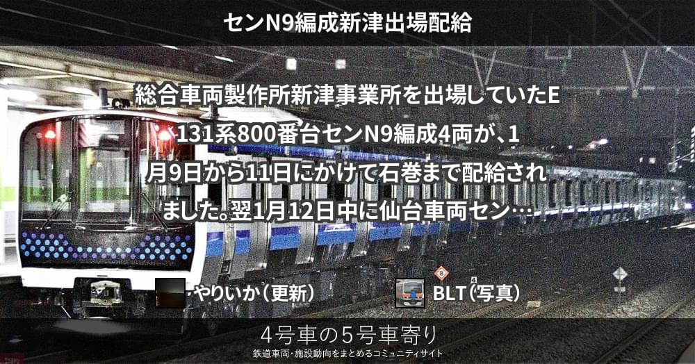 総合車両製作所新津事業所を出場していたE131系800番台センN9編成4両が、1月9日から11日にかけて石巻まで配給されました。翌1月12日中に仙台車両センター宮城野派出所まで回送されています。
