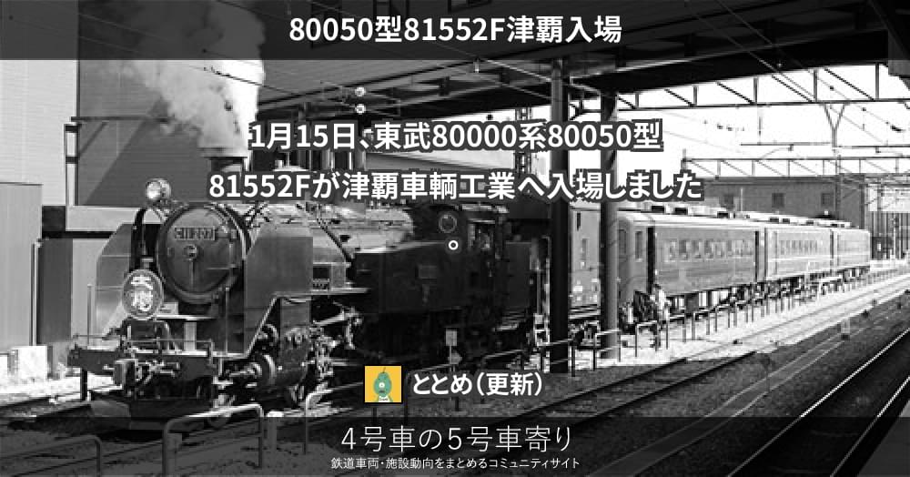 1月15日、東武80000系80050型81552Fが津覇車輌工業へ入場しました。