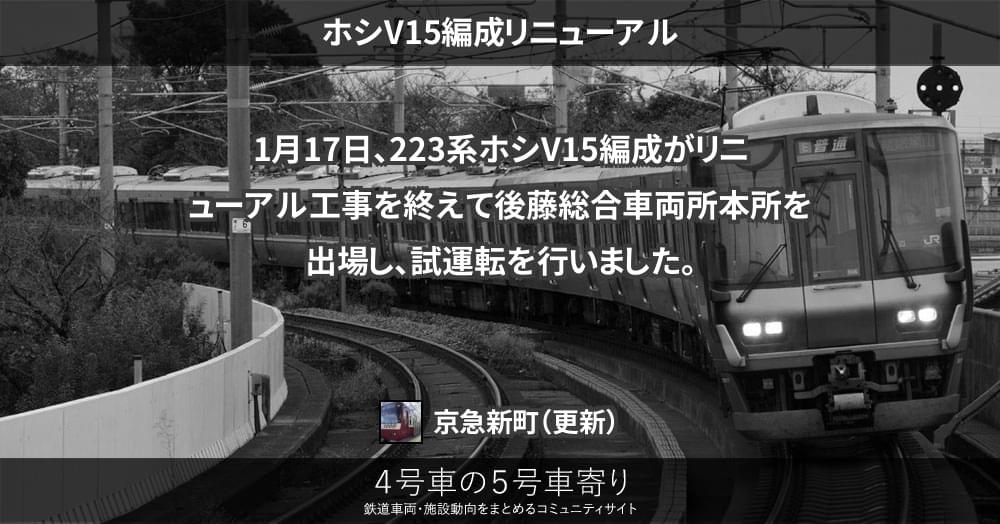 1月17日、223系ホシV15編成がリニューアル工事を終えて後藤総合車両所本所を出場し、試運転を行いました。