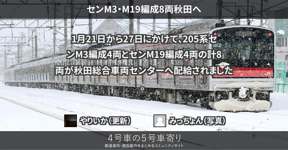 1月21日から27日にかけて、205系センM3編成4両とセンM19編成4両の計8両が秋田総合車両センターへ配給されました。