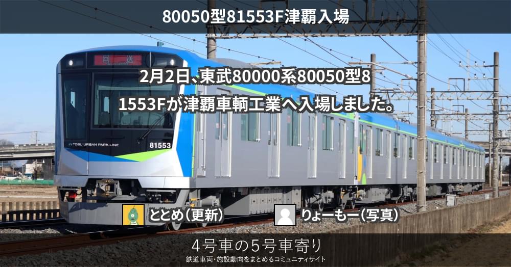 2月2日、東武80000系80050型81553Fが津覇車輌工業へ入場しました。