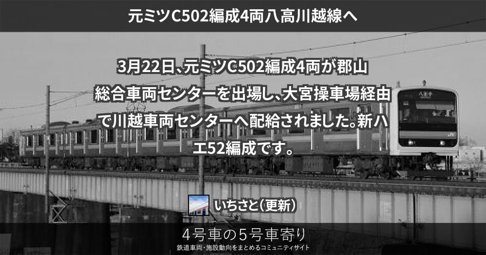 3月22日、元ミツC502編成4両が郡山総合車両センターを出場し、大宮操車場経由で川越車両センターへ配給されました。
