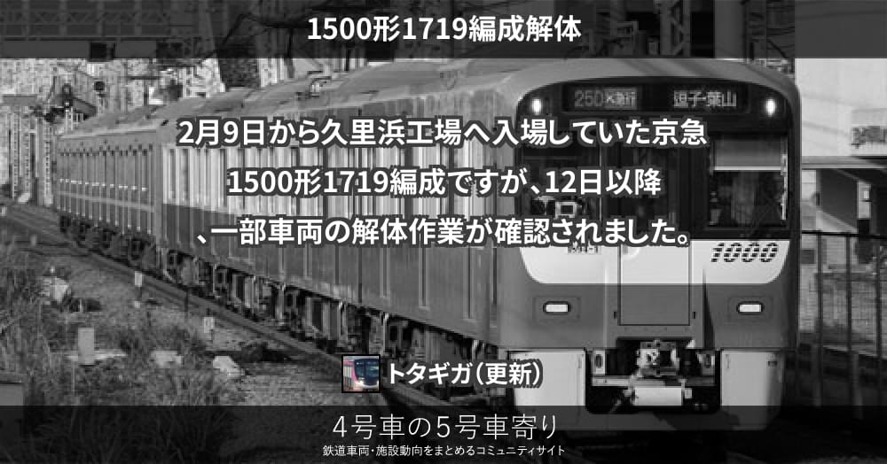 本日、京急1500形1719編成が久里浜工場内の2番ピットにて前照灯が撤去されている姿が確認されています。新1000形1702編成の営業運転開始に伴う動きとみられ、同形式のVVVF車8連が廃車となれば、2012年9月24日に追浜~京急田浦駅...