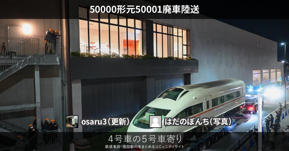 2月28日から3月1日にかけて小田急50000形50001×10(50001F)のうち50001号車が、海老名検車区から、ロマンスカーミュージアムで保存のため陸路で搬出されました。
