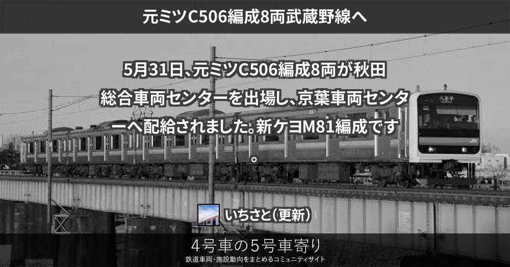 5月31日、元ミツC506編成8両が秋田総合車両センターを出場し、京葉車両センターへ配給されました。新ケヨM81編成です。