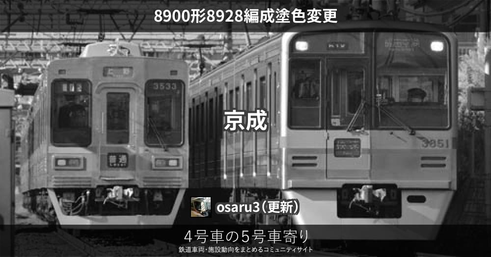 京成8900形8928編成が塗色変更を終えてくぬぎ山工場を出場し、3月16日に営業運転が確認されました。