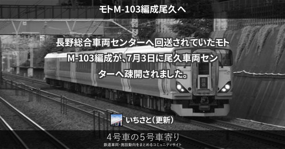 E257系 ページ目次 モトM-103編成尾久へ 更新コンテンツ サイト投稿写真 Twitterの写真 2018/07/032018/07/08 モトM-103編成尾久へ 長野総合車両センターへ回送されていたモトM-103編成が、7月3日に尾久車両センターへ疎開されました。 更新コンテンツ 404 Not Found 404 Not Found 上記コンテンツ傘下のページも含みます。 サイト投稿写真 投稿画像がありません。E257系グループのアップローダーへ投稿頂いた写真は、こちらでご紹介致します。 Twitterの写真 モトM-103編成尾久へ