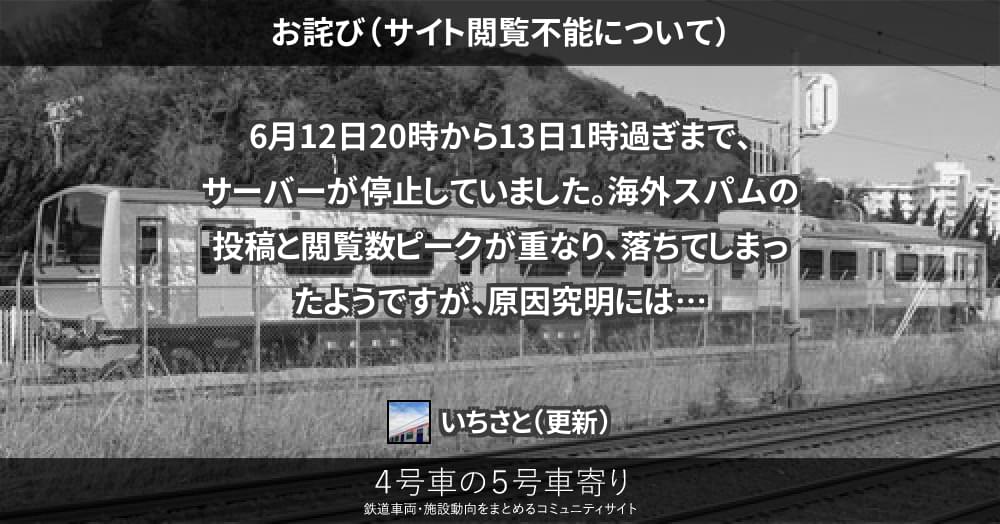 JRの車両その他(東)6月12日20時から13日1時過ぎまで、サーバーが停止していました。海外スパムの投稿と閲覧数ピークが重なり、落ちてしまったようですが、原因究明には時間がかかりそうです。申し訳ございません。