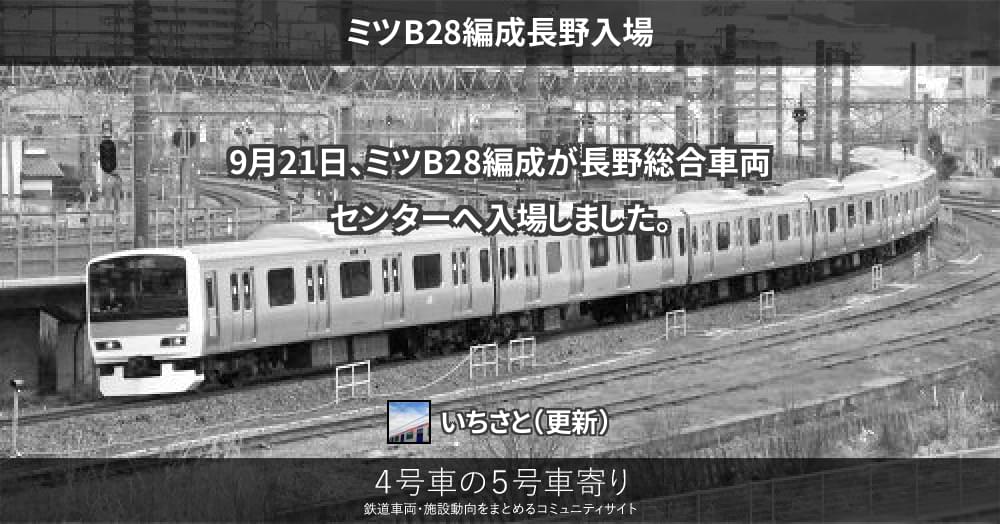 E231系 ページ目次 ミツB28編成長野入場 更新コンテンツ サイト投稿写真 Twitterの写真 2018/09/212018/09/22 ミツB28編成長野入場 9月21日、ミツB28編成が長野総合車両センターへ入場しました。 更新コンテンツ 404 Not Found 404 Not Found 上記コンテンツ傘下のページも含みます。 サイト投稿写真 投稿画像がありません。E231系グループのアップローダーへ投稿頂いた写真は、こちらでご紹介致します。 Twitterの写真 ミツB28編成長野入場