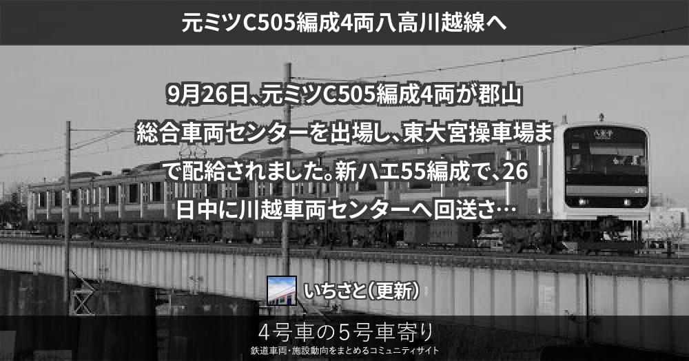 9月26日、元ミツC505編成4両が郡山総合車両センターを出場し、東大宮操車場まで配給されました。新ハエ55編成で、26日中に川越車両センターへ回送されています。