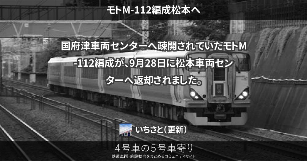 E257系 ページ目次 モトM-112編成松本へ 更新コンテンツ サイト投稿写真 2018/09/282018/11/07 モトM-112編成松本へ 国府津車両センターへ疎開されていたモトM-112編成が、9月28日に松本車両センターへ返却されました。 更新コンテンツ 404 Not Found 上記コンテンツ傘下のページも含みます。 サイト投稿写真 投稿画像がありません。E257系グループのアップローダーへ投稿頂いた写真は、こちらでご紹介致します。