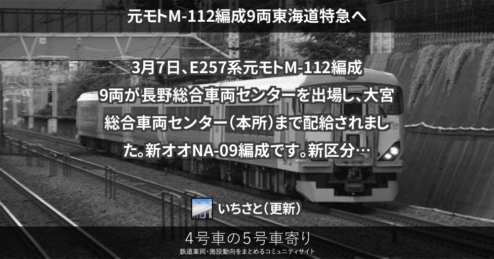 3月7日、E257系元モトM-112編成9両が長野総合車両センターを出場し、大宮総合車両センター(本所)まで配給されました。新オオNA-09編成です。