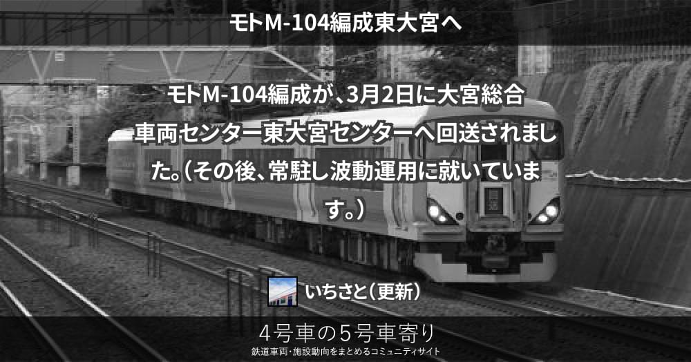 モトM-104編成が、3月2日に大宮総合車両センター東大宮センターへ回送されました。(その後、常駐し波動運用に就いています。)