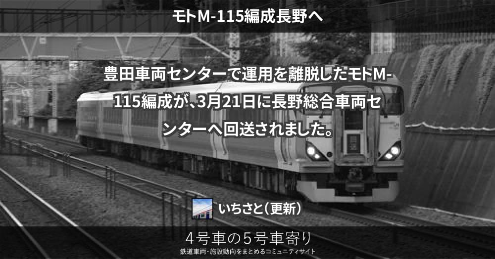 豊田車両センターで運用を離脱したモトM-115編成が、3月21日に長野総合車両センターへ回送されました。
