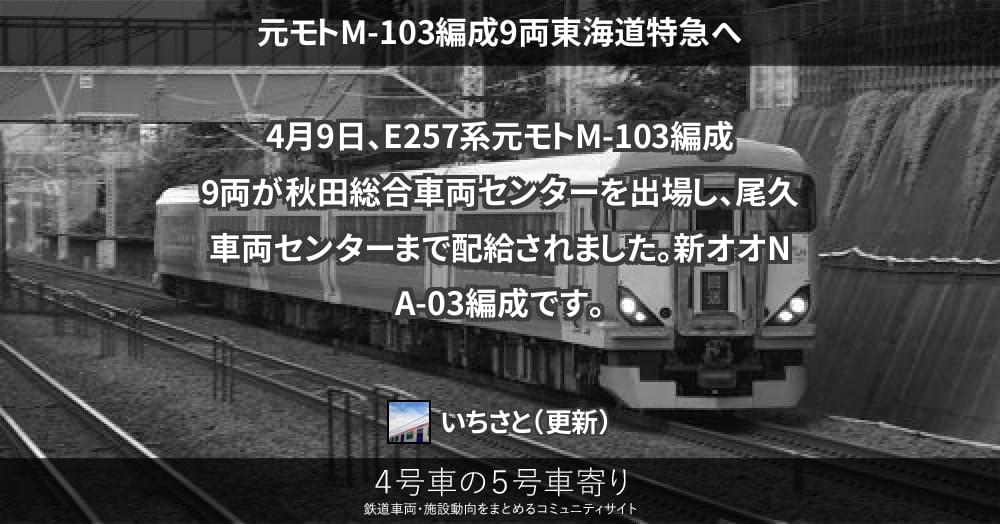 4月9日、E257系元モトM-103編成9両が秋田総合車両センターを出場し、尾久車両センターまで配給されました。新オオNA-03編成です。