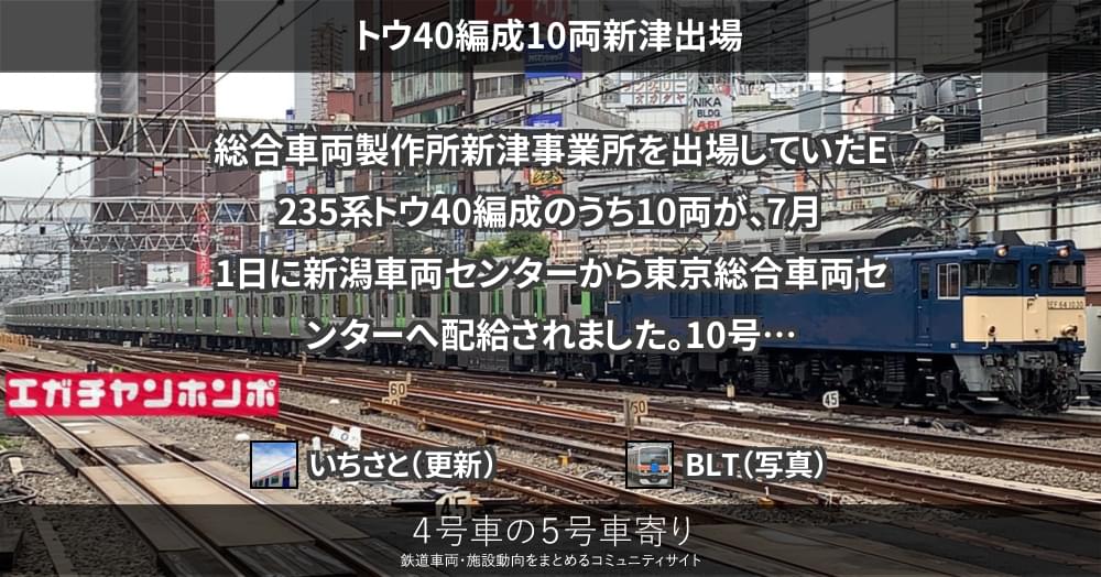 総合車両製作所新津事業所を出場していたE235系トウ40編成のうち10両が、7月1日に新潟車両センターから東京総合車両センターへ配給されました。