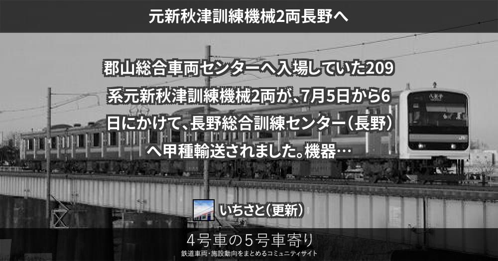 郡山総合車両センターへ入場していた209系元新秋津訓練機械2両が、7月5日から6日にかけて、長野総合訓練センター(長野)へ甲種輸送されました。機器更新済みの長野訓練機械になります。