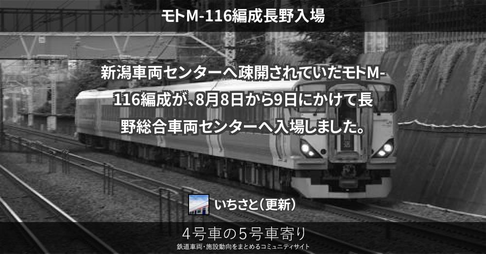 E257系 ページ目次 モトM-116編成長野入場 更新コンテンツ サイト投稿写真 Twitterの写真 2019/08/092019/08/20 モトM-116編成長野入場 新潟車両センターへ疎開されていたモトM-116編成が、8月8日から9日にかけて長野総合車両センターへ入場しました。 更新コンテンツ 301 Moved Permanently 上記コンテンツ傘下のページも含みます。 サイト投稿写真 投稿画像がありません。E257系グループのアップローダーへ投稿頂いた写真は、こちらでご紹介致します。 Twitterの写真 モトM-116編成長野入場