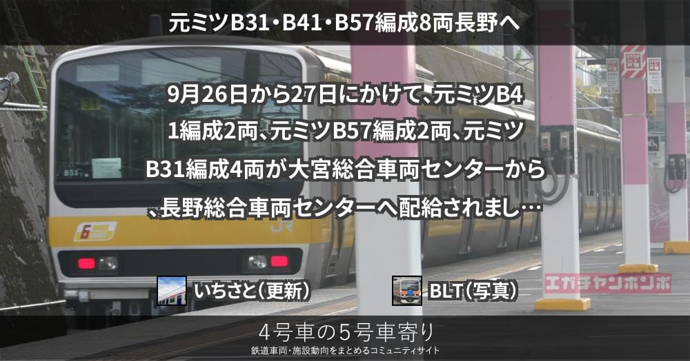 E231系9月26日から27日にかけて、元ミツB41編成2両、元ミツB57編成2両、元ミツB31編成4両が大宮総合車両センターから、長野総合車両センターへ配給されました。