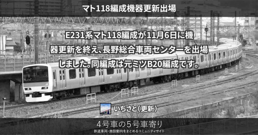E231系マト118編成が11月6日に機器更新を終え、長野総合車両センターを出場しました。