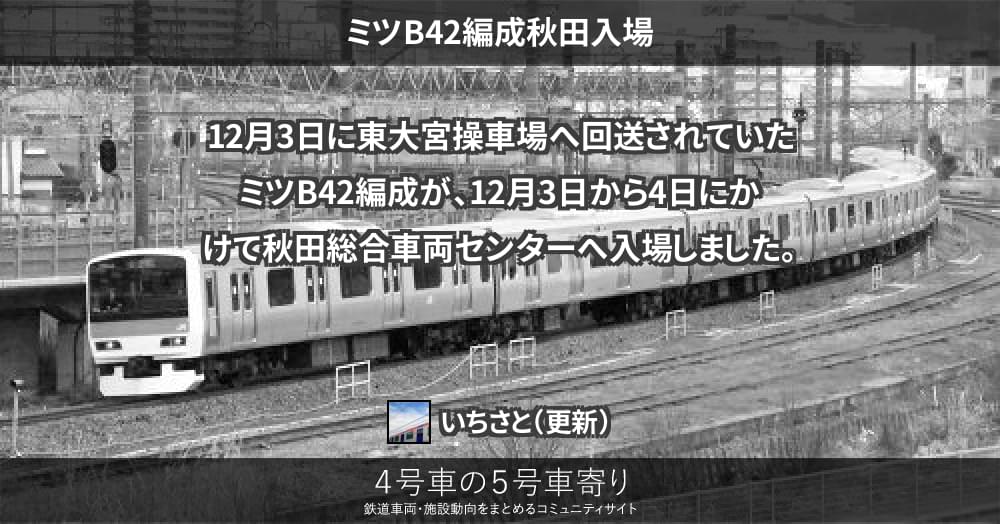 12月3日に東大宮操車場へ回送されていたミツB42編成が、12月3日から4日にかけて秋田総合車両センターへ入場しました。