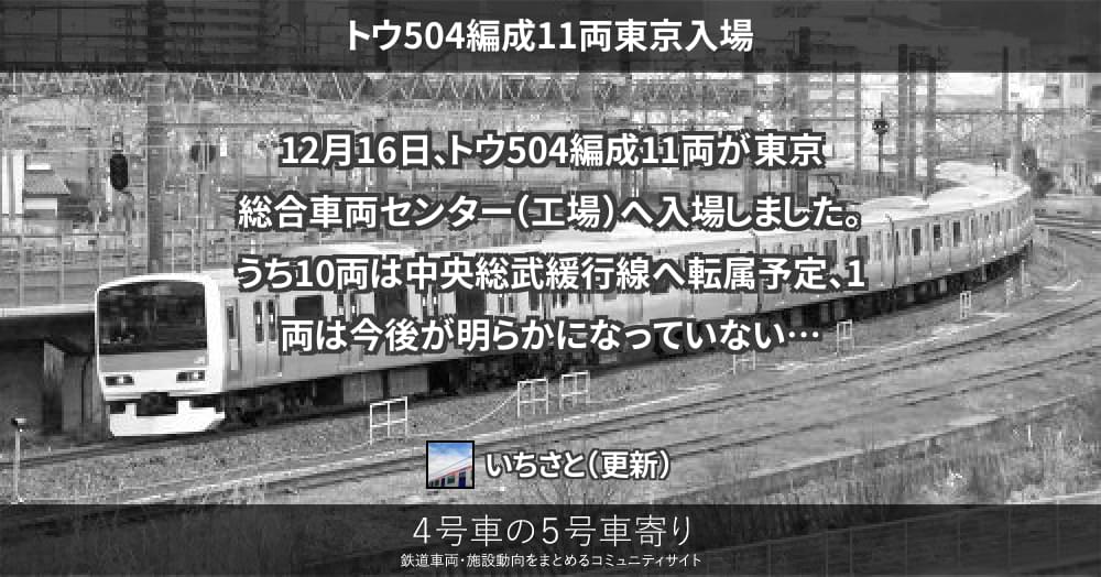 12月16日、トウ504編成11両が東京総合車両センター(工場)へ入場しました。うち10両は中央総武緩行線へ転属予定、1両は今後が明らかになっていない車両です。