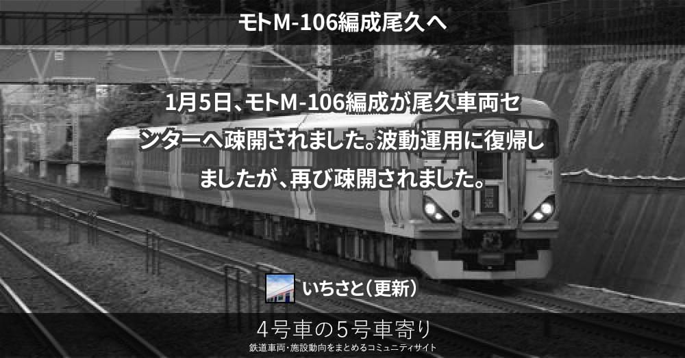 E257系 ページ目次 モトM-106編成尾久へ 更新コンテンツ サイト投稿写真 Twitterの写真 2020/01/052020/01/07 モトM-106編成尾久へ 1月5日、モトM-106編成が尾久車両センターへ疎開されました。波動運用に復帰しましたが、再び疎開されました。 更新コンテンツ 404 Not Found 上記コンテンツ傘下のページも含みます。 サイト投稿写真 投稿画像がありません。E257系グループのアップローダーへ投稿頂いた写真は、こちらでご紹介致します。 Twitterの写真 モトM-106編成尾久へ