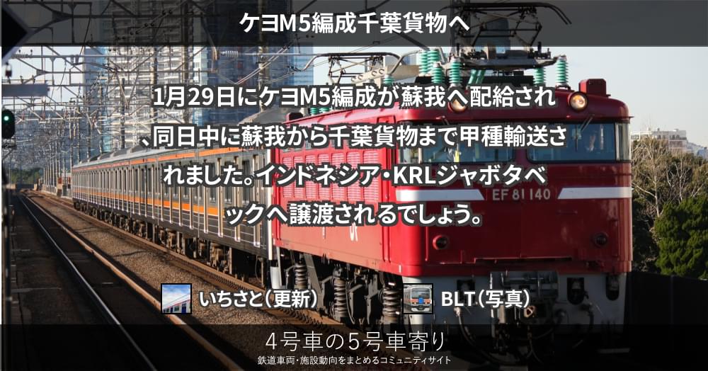 1月29日にケヨM5編成が蘇我へ配給され、同日中に蘇我から千葉貨物まで甲種輸送されました。インドネシア・KRLジャボタベックへ譲渡されるでしょう。
