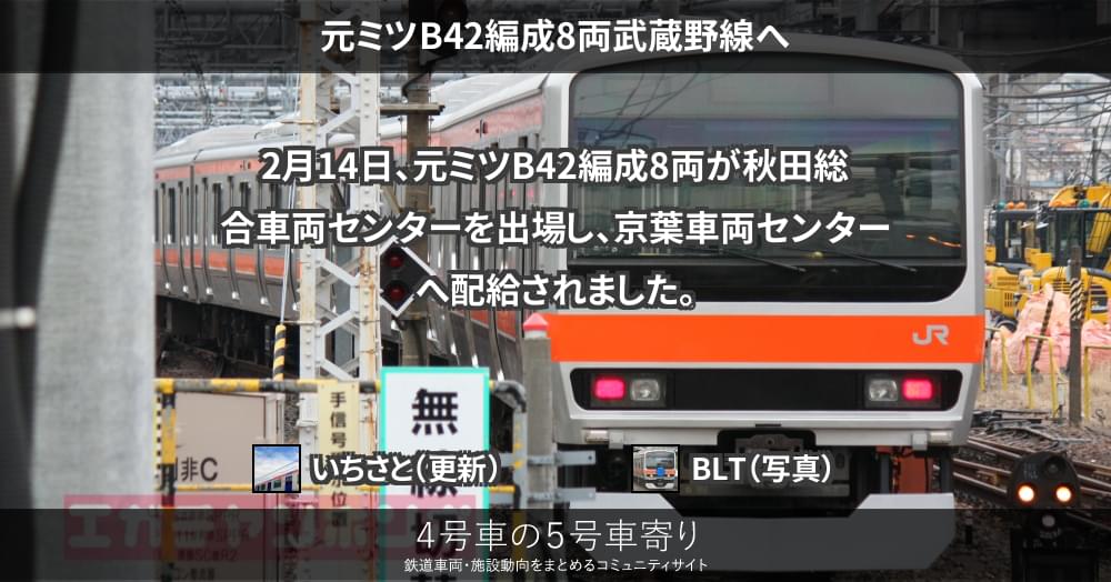 E231系 ページ目次 元ミツB42編成8両武蔵野線へ 更新コンテンツ サイト投稿写真 2020/02/14 元ミツB42編成8両武蔵野線へ 2月14日、元ミツB42編成8両が秋田総合車両センターを出場し、京葉車両センターへ配給されました。 更新コンテンツ 404 Not Found 404 Not Found 上記コンテンツ傘下のページも含みます。 サイト投稿写真 BLT 撮影者サイト 配給される元ミツB42編成。 6010 撮影者サイト未設定 牽引はEF81 140。