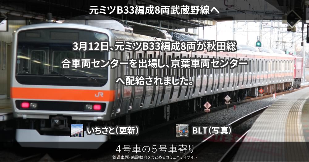 E231系 ページ目次 元ミツB33編成8両武蔵野線へ 更新コンテンツ サイト投稿写真 2020/03/12 元ミツB33編成8両武蔵野線へ 3月12日、元ミツB33編成8両が秋田総合車両センターを出場し、京葉車両センターへ配給されました。 更新コンテンツ 404 Not Found 404 Not Found 上記コンテンツ傘下のページも含みます。 サイト投稿写真 BLT 撮影者サイト 青森で改造され、秋田でカラー帯を変えた武蔵野線向けE231系は、1本目のケヨMU2編成以来です。 BLT 撮影者サイト 牽引はEF81 141。