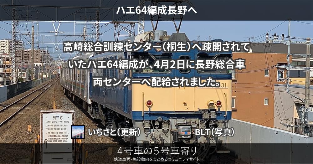 高崎総合訓練センター(桐生)へ疎開されていたハエ64編成が、4月2日に長野総合車両センターへ配給されました。
