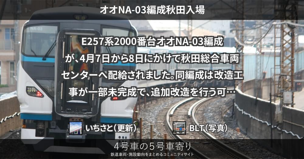 E257系E257系2000番台オオNA-03編成が、4月7日から8日にかけて秋田総合車両センターへ配給されました。
