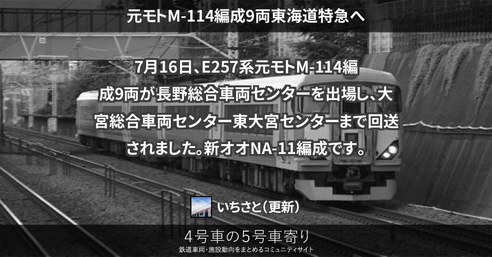 7月16日、E257系元モトM-114編成9両が長野総合車両センターを出場し、大宮総合車両センター東大宮センターまで回送されました。新オオNA-11編成です。