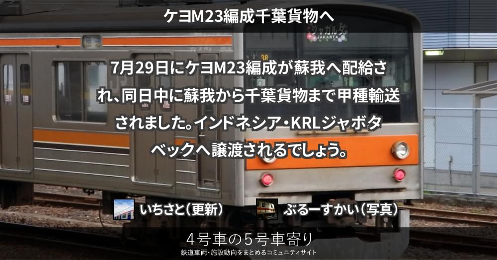 7月29日にケヨM23編成が蘇我へ配給され、同日中に蘇我から千葉貨物まで甲種輸送されました。インドネシア・KRLジャボタベックへ譲渡されるでしょう。