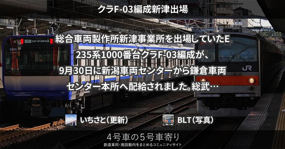 総合車両製作所新津事業所を出場していたE235系1000番台クラF-03編成が、9月30日に新潟車両センターから鎌倉車両センター本所へ配給されました。
