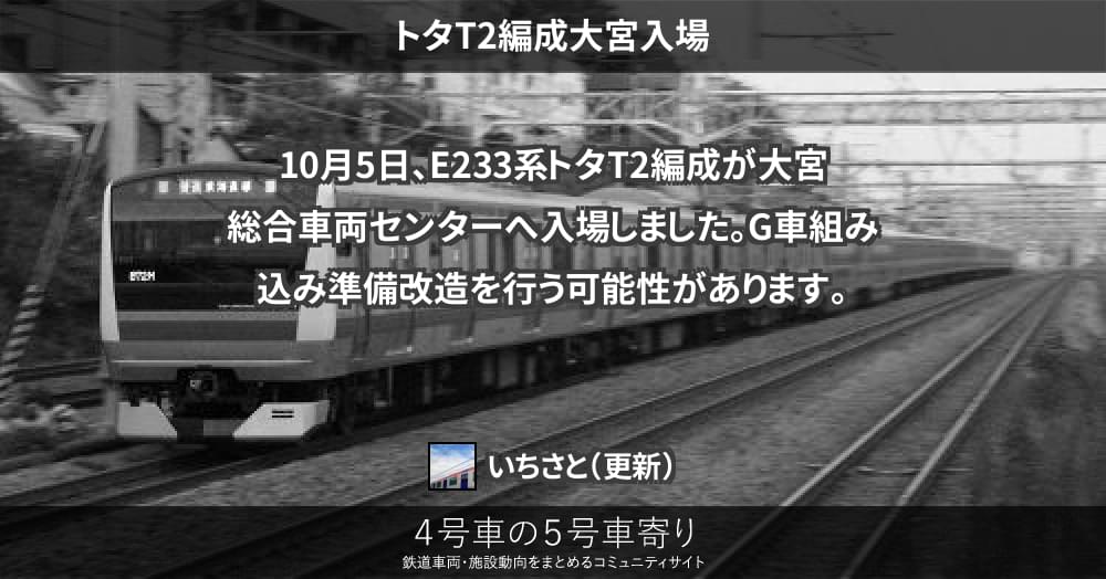 10月5日、E233系トタT2編成が大宮総合車両センターへ入場しました。